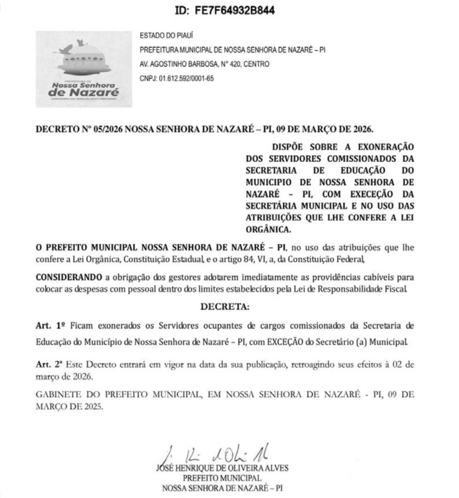 A Prefeitura de Nossa Senhora de Nazaré (PI) publicou nesta sexta-feira (10/04), no Diário Oficial das Prefeituras Piauienses, o Decreto nº 05/2026, que determina a exoneração de servidores comissionados da Secretaria Municipal de Educação.