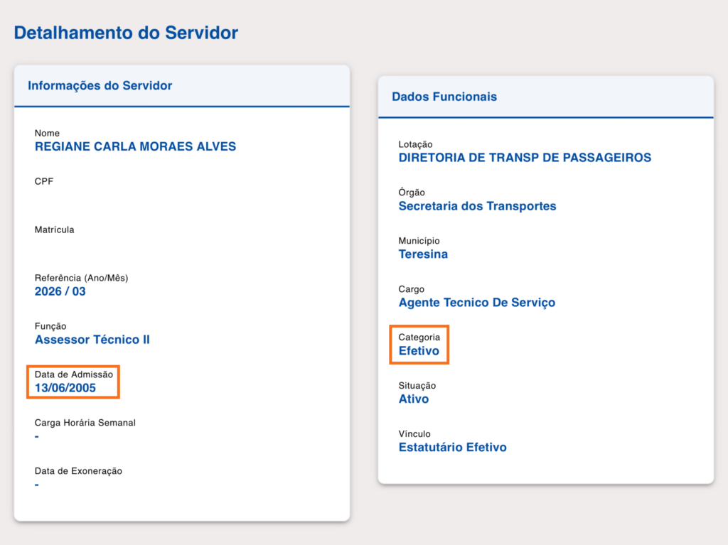 Dados obtidos apontam que Regiane Carla Moraes Alves é servidora estadual desde 13 de junho de 2005, no cargo de Assessor Técnico II.
