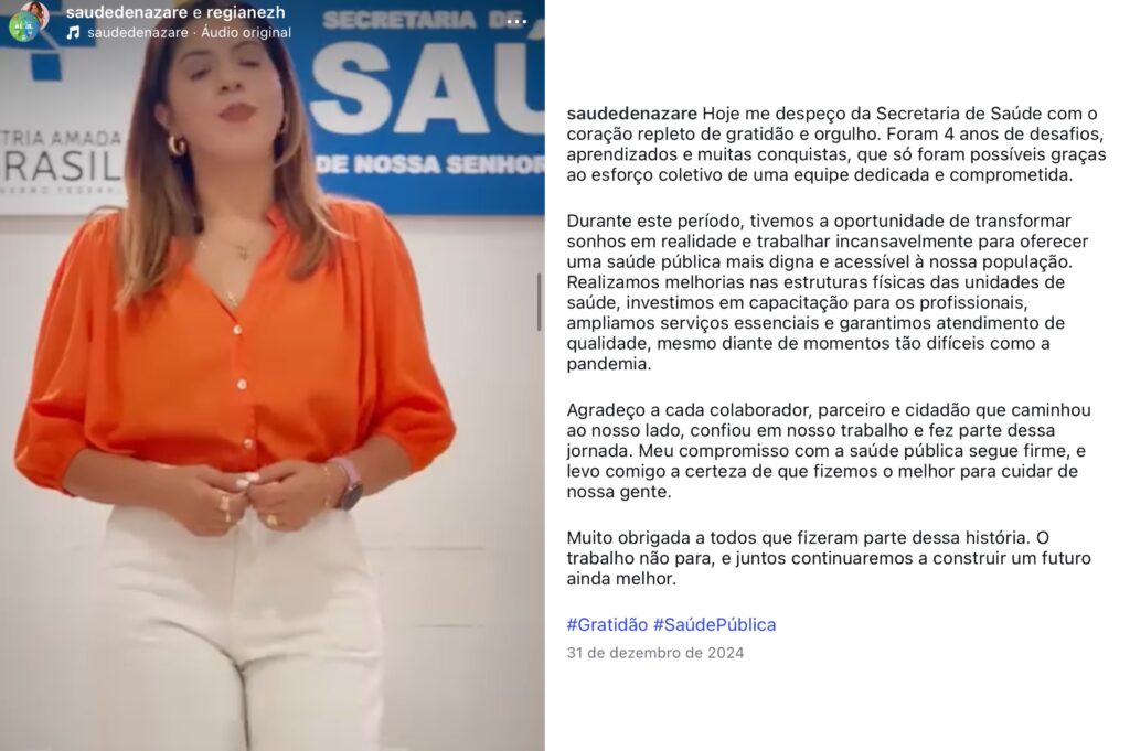 No dia seguinte, sexta-feira (10/04), Regiane publicou um vídeo confirmando a informação e anunciando que deixaria o cargo na gestão municipal.