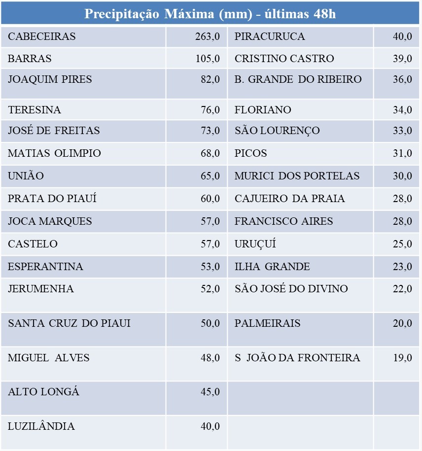 O Piauí registrou fortes chuvas nas últimas 48 horas, com mais de 30 municípios acumulando volumes superiores a 20 milímetros entre sábado e domingo, segundo dados da Secretaria de Meio Ambiente e Recursos Hídricos (Semarh).