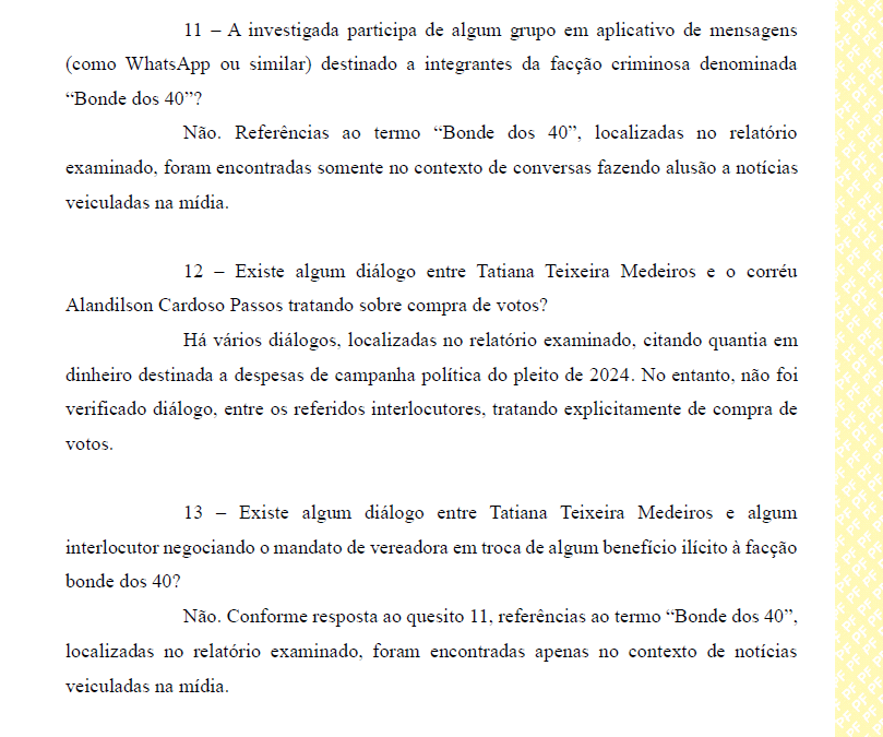 Um laudo produzido pela Polícia Federal concluiu que não foram encontradas ordens diretas de compra de votos nem indícios de vínculo com facção criminosa no relatório extraído do celular da vereadora Tatiana Medeiros, presa desde abril de 2024 sob suspeita de crimes eleitorais e envolvimento com organização criminosa. O documento integra a Ação Penal Eleitoral que tramita na Justiça e foi elaborado a partir do relatório técnico de extração forense, já que o aparelho físico não foi disponibilizado aos peritos.