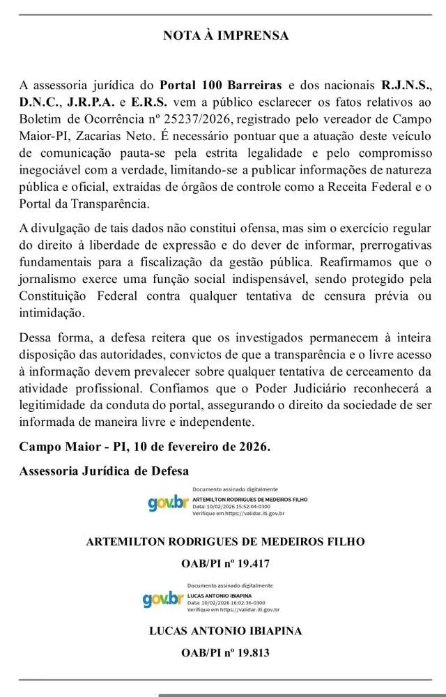 Os advogados do Portal 100barreiras e dos envolvidos divulgaram uma nota sobre o caso.