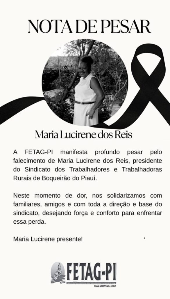 A Federação dos Trabalhadores na Agricultura do Piauí (FETAG-PI) também publicou nota de pesar, destacando a trajetória de luta de Maria Lucirene e prestando solidariedade à família e à base sindical.
