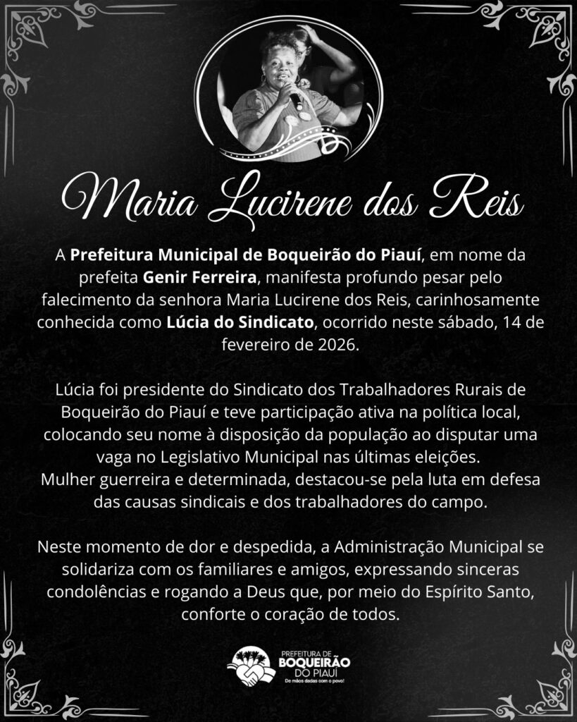 A Prefeitura Municipal de Boqueirão do Piauí, em nome da prefeita Genir Ferreira, manifestou profundo pesar pelo falecimento de Maria Lucirene dos Reis, ressaltando sua atuação em defesa dos trabalhadores rurais e se solidarizando com familiares e amigos.