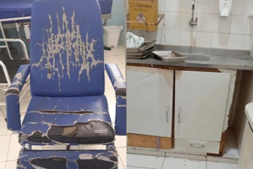 As imagens exibem pontos da unidade com paredes úmidas, descascadas e com sinais visíveis de infiltração. Também é possível perceber cadeiras e macas danificadas, além de equipamentos com erosão na superfície, indicando desgaste pelo uso contínuo.