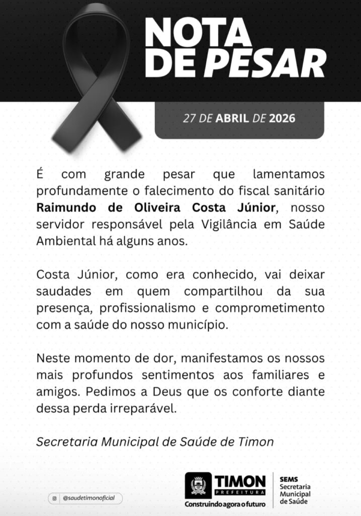 A Secretaria Municipal de Saúde de Timon também divulgou nota oficial, destacando a trajetória do profissional e seu compromisso com a saúde pública, ressaltando que ele deixará saudades entre aqueles que conviveram com seu trabalho e dedicação ao município.