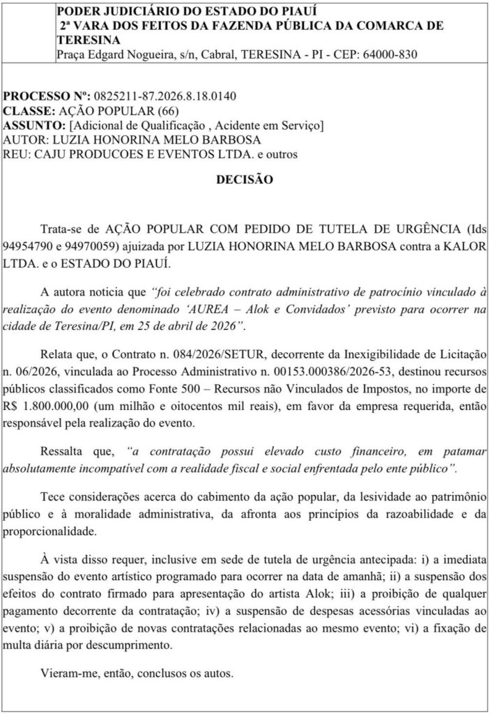 Um evento artístico que seria realizado em Teresina foi suspenso por decisão judicial após questionamentos envolvendo o uso de dinheiro público. O show “AUREA – Alok e Convidados”, previsto para o dia 25 de abril de 2026, não poderá ocorrer até nova deliberação da Justiça.
